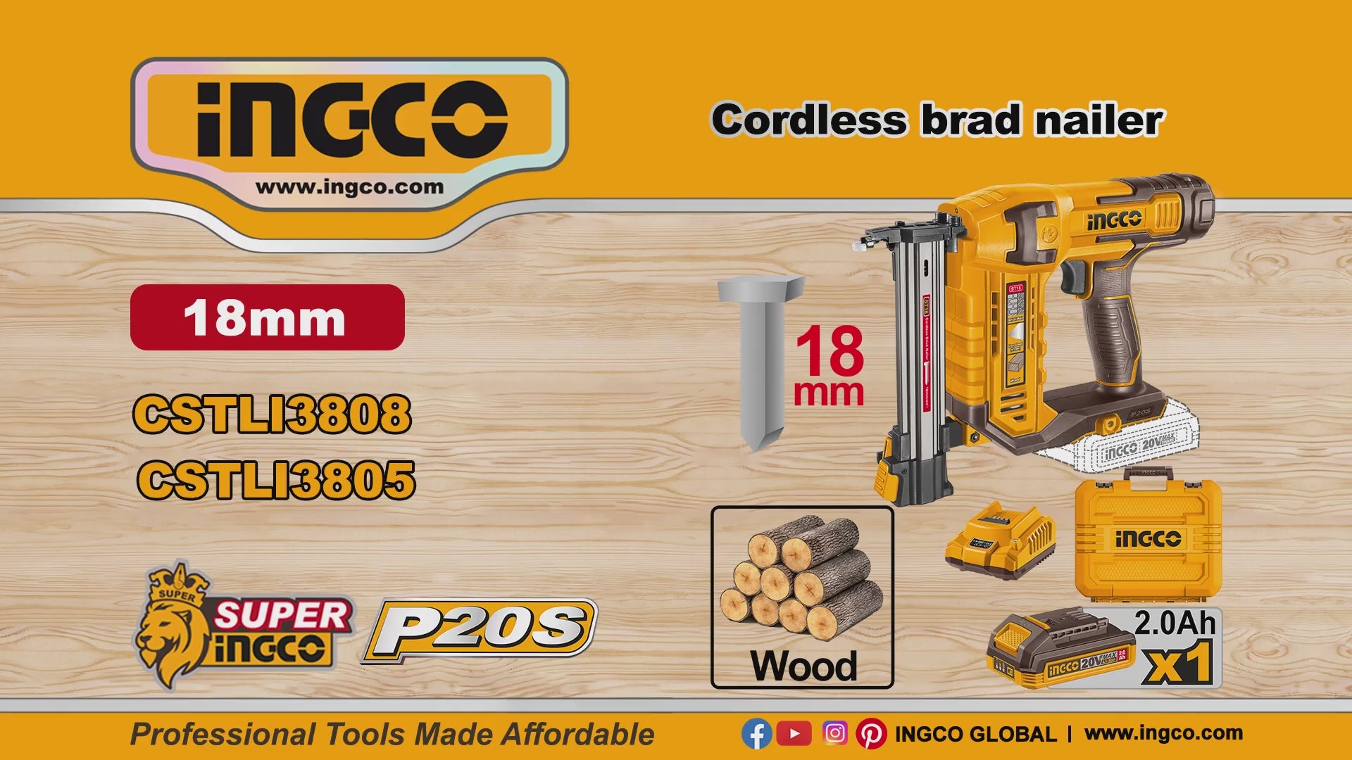 Cordless 20V Brick Nailer using ST18mm nail type. Drive rate 2 nails/s. Magazine capacity 65pcs. For Brick, Concrete, Iron Sheets, Wood. Includes: 200 pcs concrete nails 18mm, 1 pcs air nozzle, 1 pcs pin, 1 pcs 20V 2.0Ah battery and charger. Case.
