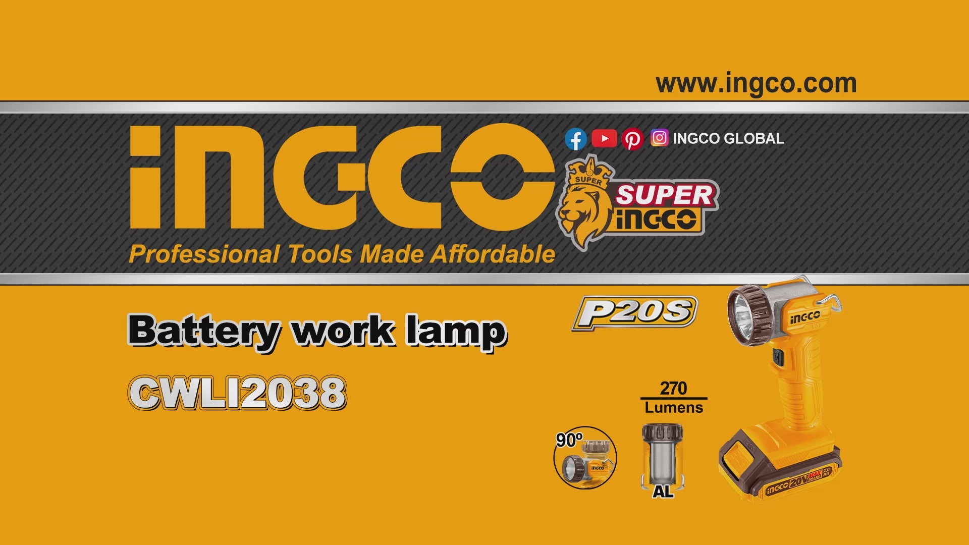 INGCO LED Work Lamp with swivel head. Lumens: 270. Hook for hanging. Battery and charger not included.